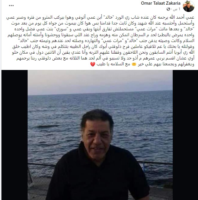 ونشر عمر طلعت زكريا، على صفحته بمواقع التواصل الاجتماعي، الأزمات التي تعرضت لها عائلته: عمي أحمد الله يرحمه كان عنده شاب زي الورد خالد ابن عمي، توفي وهو بيركب المترو من فترة، وصبر عمي واستحمل واحتسبه عند الله شهيدًا، وكان ثابت جدًا قدامنا، بس هوا كان بيموت من جواه كل يوم من بعد موت خالد، وبعدها ماتت مرات عمي مستحملتش تفارق ابنها.