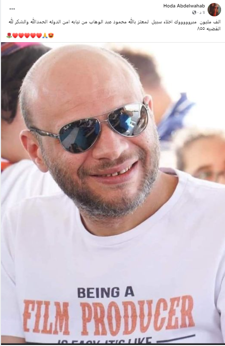 أعلنت المحامية هدى عبد الوهاب، إخلاء سبيل المنتج السينمائي معتز بالله عبدالوهاب حسين، من نيابة أمن الدولة، على خلفية اتهامه في القضية 586 لسنة 2020 حصر أمن دولة.