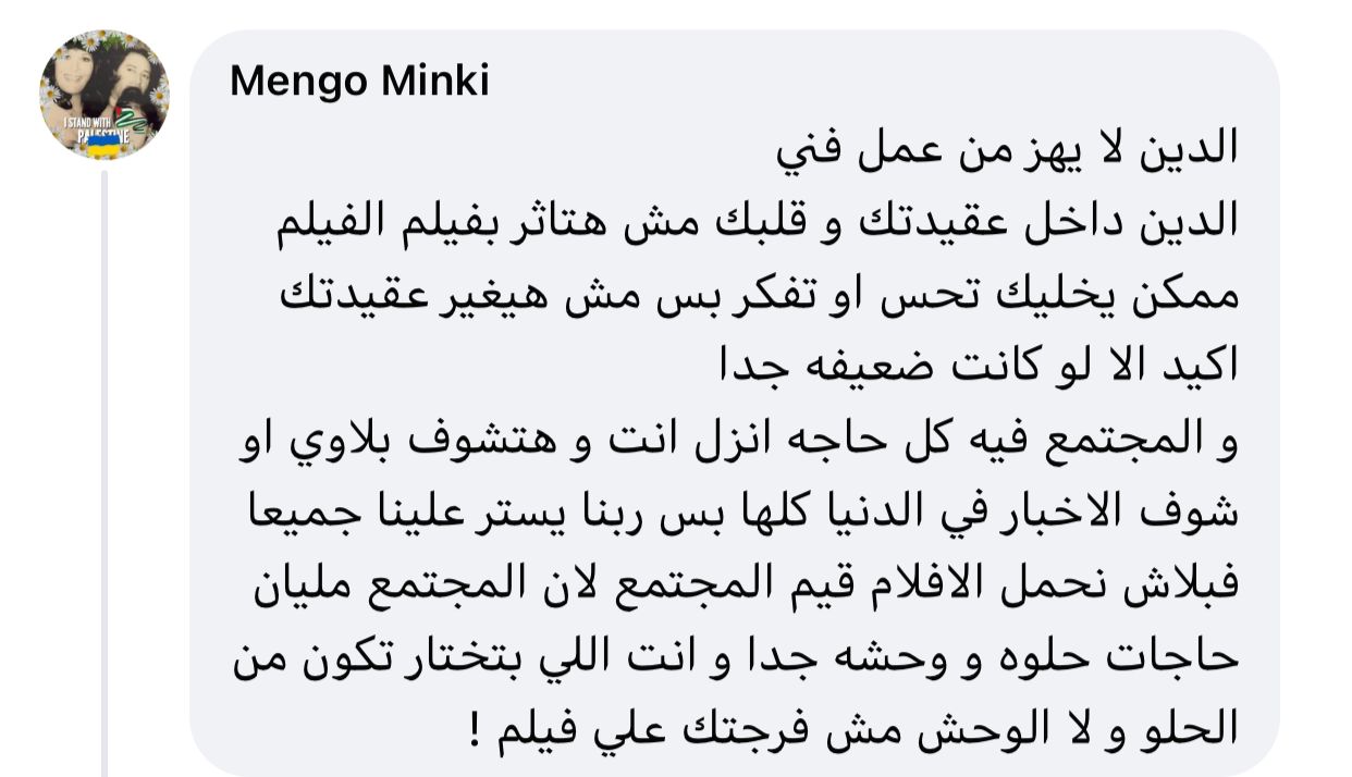 وكتبت منة شلبي عبر حسابها على فيسبوك: العمل الفني لا يهز الدين؛ لأنه داخل عقيدتك وقلبك ولن يتأثر بفيلم، الفن يجعلك تشعر وتفكر ولكنه لن يغير عقيدتك إلا إذا كانت ضعيفة.