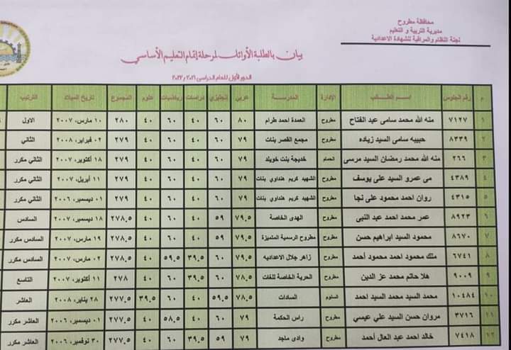 ننشر أسماء أوائل الشهادة الإعدادية بمطروح