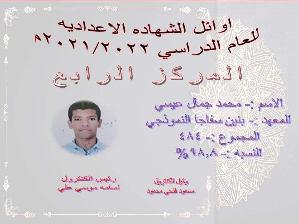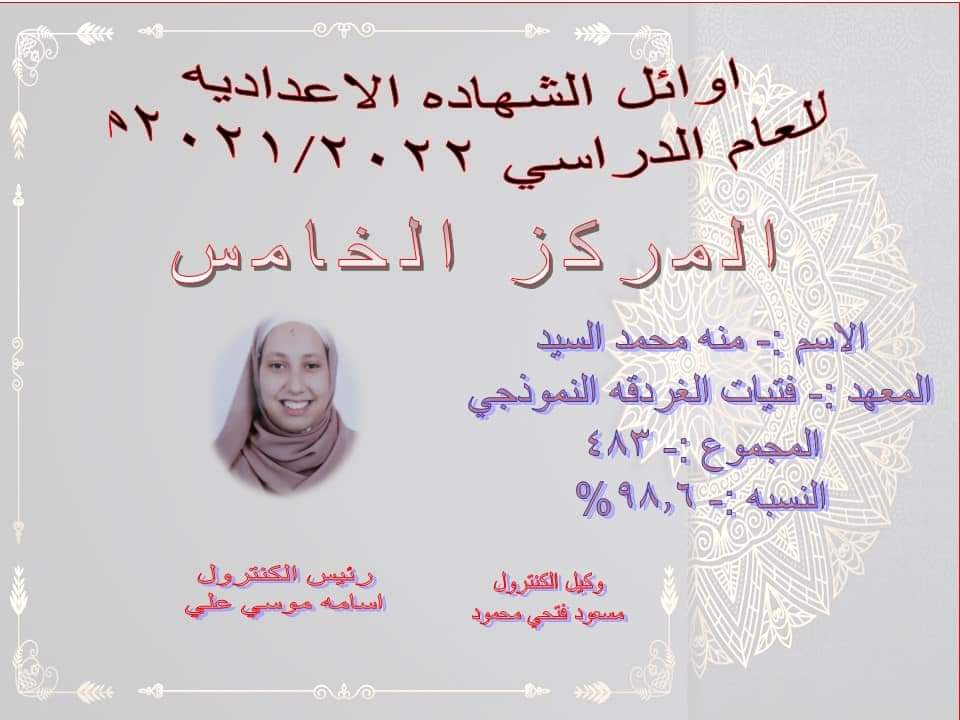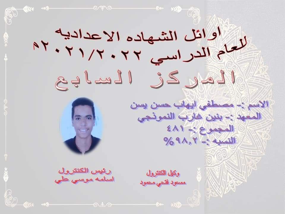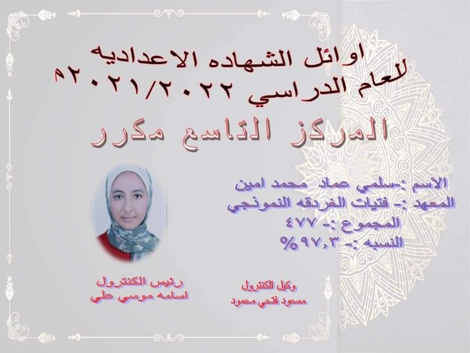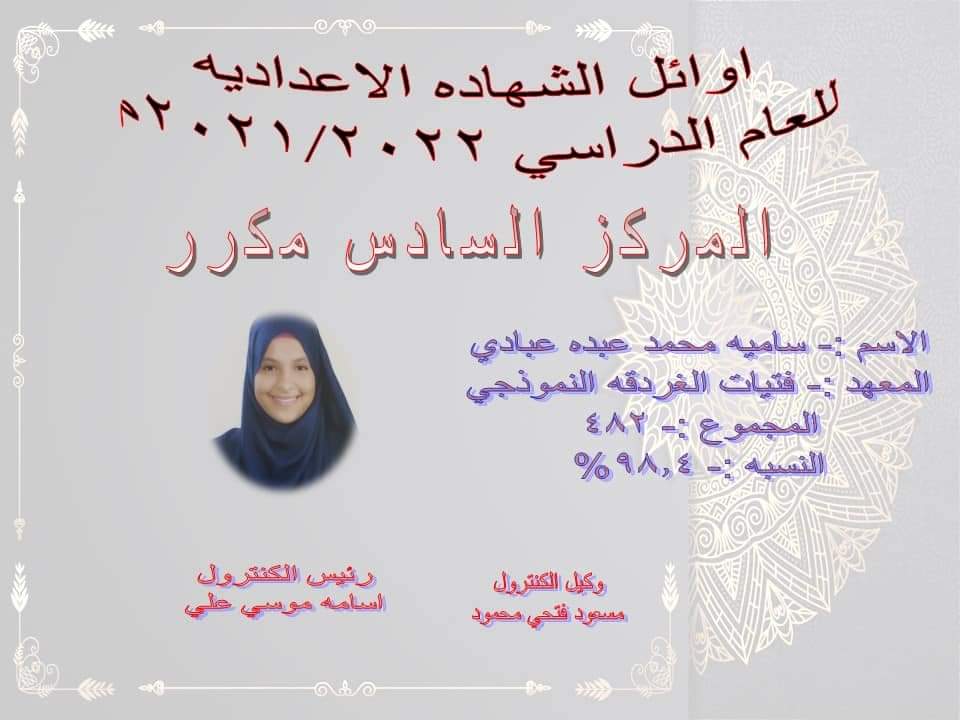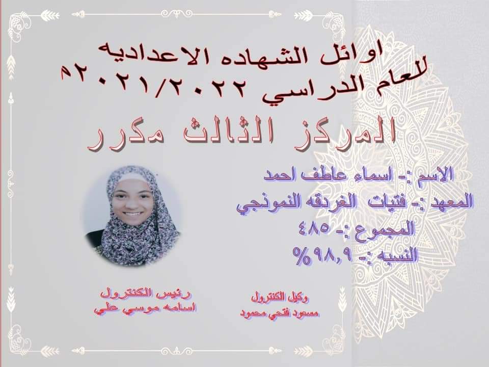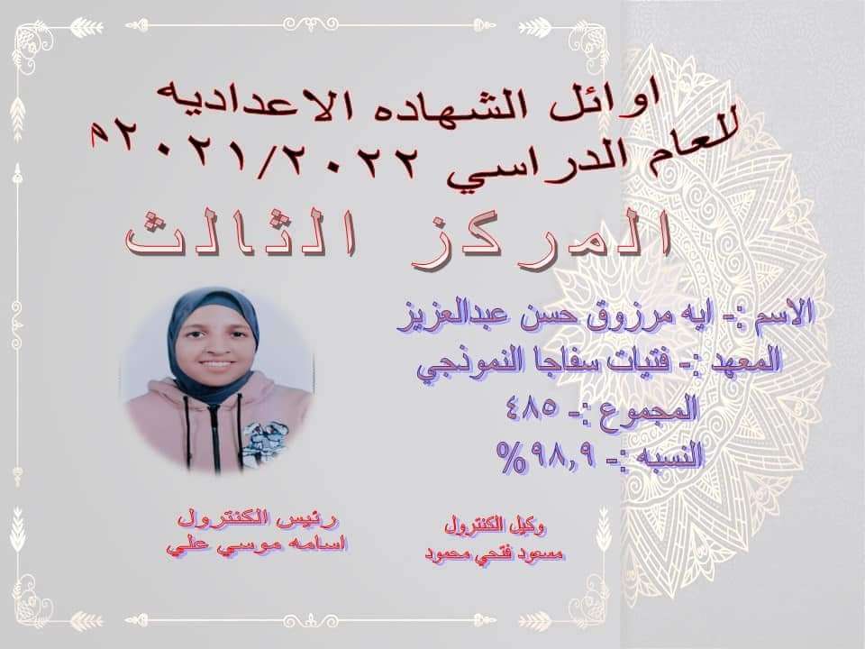 المركز الأول روان عبد السلام النجار معهد فتيات سفاجا، المركز الثاني سارة عبدالحميد عبد الغني معهد فتيات الغردقة، المركز الثالث أية مرزوق حسن معهد فتيات سفاجا، الثالث مكرر أسماء عاطف أحمد، المركز الرابع محمد جمال معهد بنين سفاجا، المركز الخامس منة محمد السيد معهد فتيات الغردقة، المركز السادس إسلام عبد المنعم عابدين معهد بنين الغردقة، المركز السادس مكرر سامية محمد عبده معهد فتيات الغردقة، المركز السابع مصطفى إيهاب حسن معهد بنين رأس غارب النموذجي، المركز الثامن هاجر امير مغربي معهد فتيات الغردقة، المركز التاسع سلمى عماد محمد معهد فتيات الغردقة، المركز العاشر سراج الدين احمد عبدالفتاح معهد بنين الغردقة النموذجي.