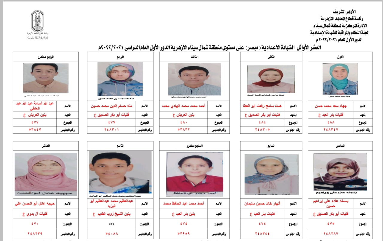 ننشر أسماء العشر الأوائل بالشهادة الإعدادية الأزهرية في شمال سيناء