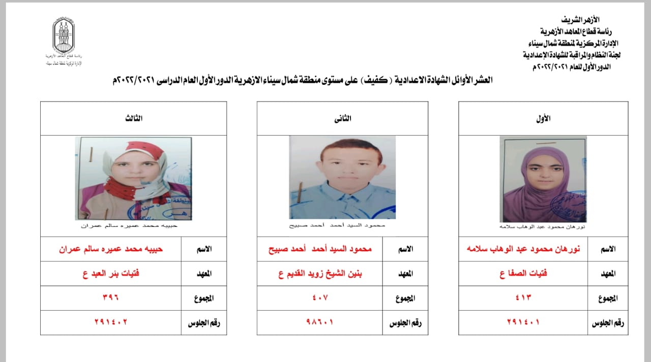 أوائل الشهادة الإعدادية الأزهرية كفيف بشمال سيناء هم: