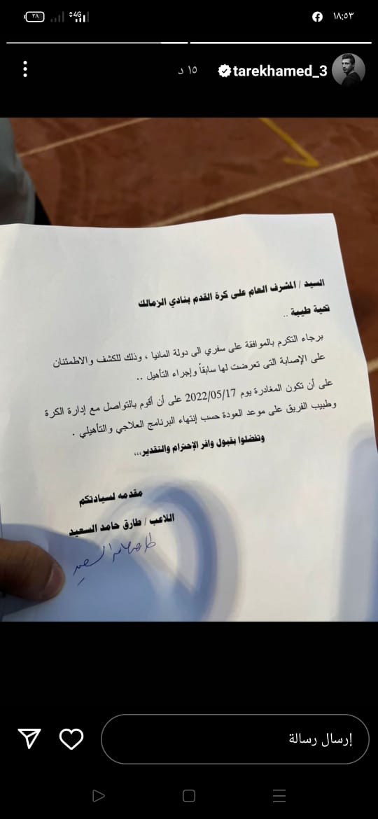 وجاءت الورقة الأولى المنشورة من جانب طارق متضمنة طلبا إلى المشرف العام على الكرة أمير مرتضى منصور بأنه يطلب التكرم بالموافقة على السفر إلى ألمانيا لإجراء الكشف والاطمئنان على الإصابة التي سبق وتعرض لها وإجراءات التأهيل.
