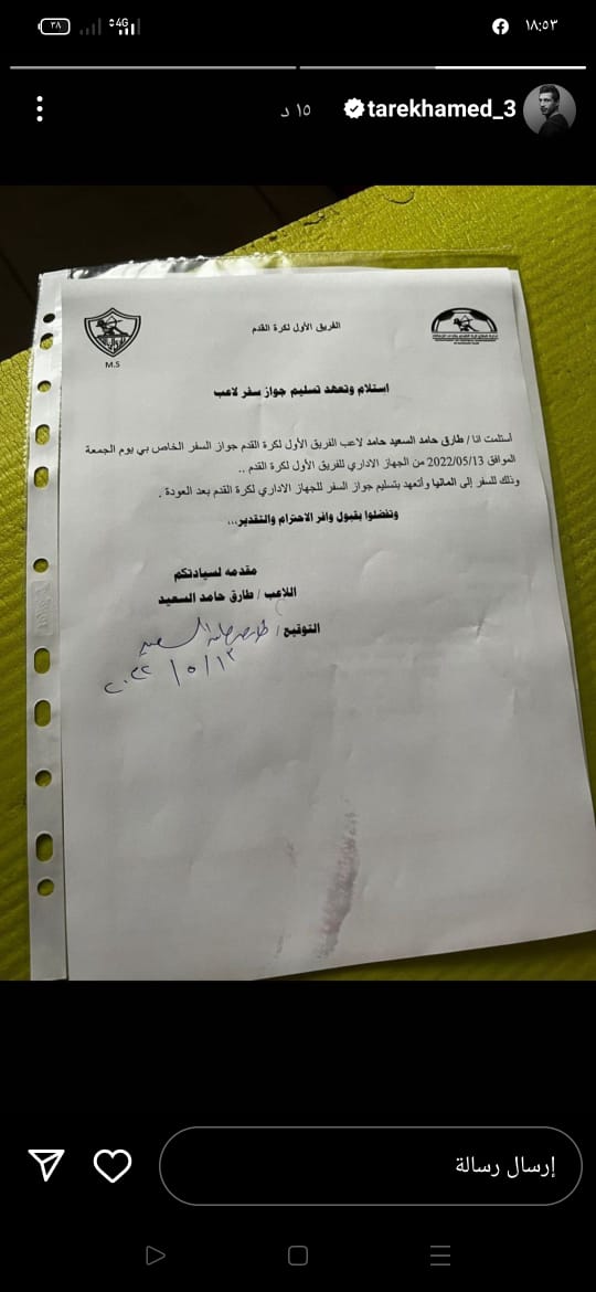 ونشر طارق ورقة ثانية تفيد باستلامه جواز السفر الخاص به يوم 13 مايو من الجهاز الإداري للفريق الأبيض للسفر إلى ألمانيا وإقرار على أن يعيده من جديد عقب العودة من السفر.