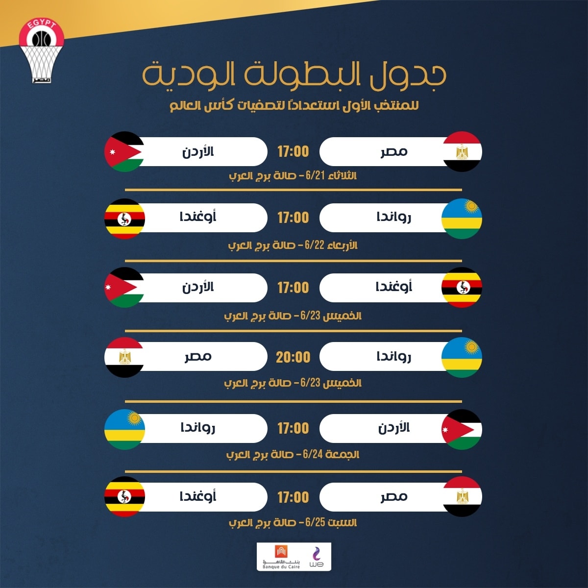 يلعب منتخب مصر لكرة السلة مع نظيره الأردن يوم الثلاثاء الموافق 21 يونيو الساعة 5 مساء.