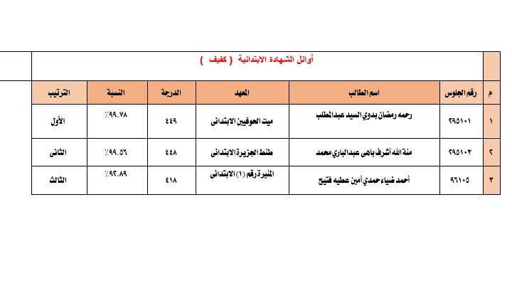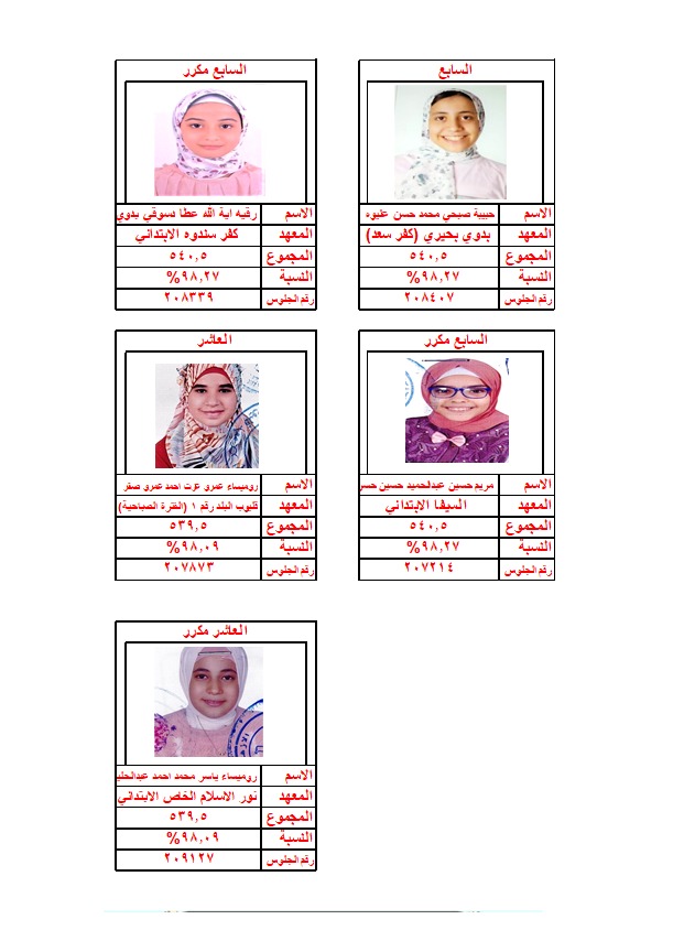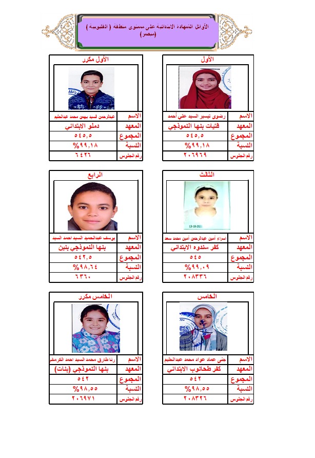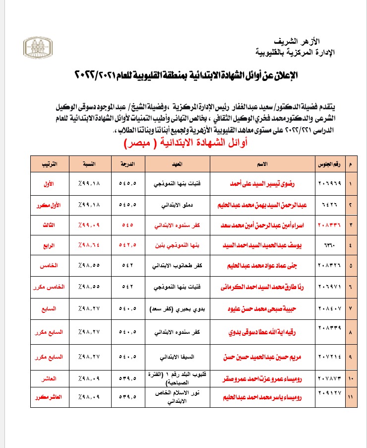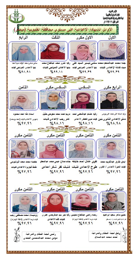 الفتيات يتفوقن على البنين.. ننشر أسماء أوائل الشهادتين الابتدائية والإعدادية أزهر بالقليوبية