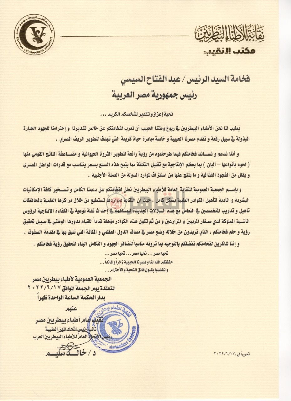 وجاء في نص الخطاب: يطيب لنا نحن الأطباء البيطريين في ربوع وطننا الحبيب أن نعرب عن خالص تقديرنا واحترامنا للجهود الجبارة المبذولة في سبيل رفعة وتقدم مصرنا الحبيبة وخاصة مبادرة حياة كريمة التي تهدف لتطوير الريف المصري.