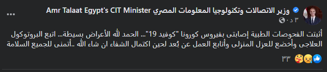 وكتب وزير الاتصالات، عبر حسابه الشخصي بموقع التواصل الاجتماعي فيسبوك: أثبتت الفحوصات الطبية إصابتي بفيروس كورونا... الحمد لله الأعراض بسيطة.