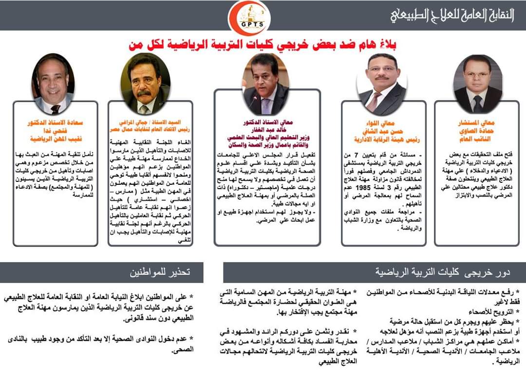 تقدمت النقابة العامة للعلاج الطبيعي، بلاغات ضد بعض خريجي كليات التربية الرياضية، لكل من المستشار حمادة الصاوي، النائب العام، اللواء حسن عبد الشافي، الدكتور خالد عبد الغفار وزير التعليم العالي والبحث العلمي والقائم بأعمال وزير الصحة، جمالي المراغي رئيس الاتحاد العام لنقابات عمال مصر، الدكتور فتحي ندا نقيب المهن الرياضية.
