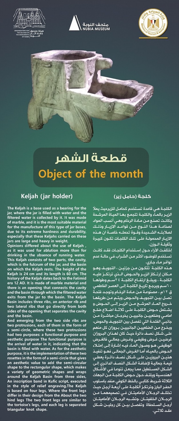 أعلن متحف النوبة، عرض قطع أثرية فريدة من نوعها، ومنها لـ كلجة، وهي قاعدة تستخدم كحامل للزير، حيث يملأ الزير بالماء، والكلجة تتجمع بها المياه المرشحة، وكانت تُصنع من مادة الرخام، وهي أنسب المواد لصناعة هذا النوع من قواعد الأزيار، وذلك لصلابته الشديدة وقوة تحمله خاصة.