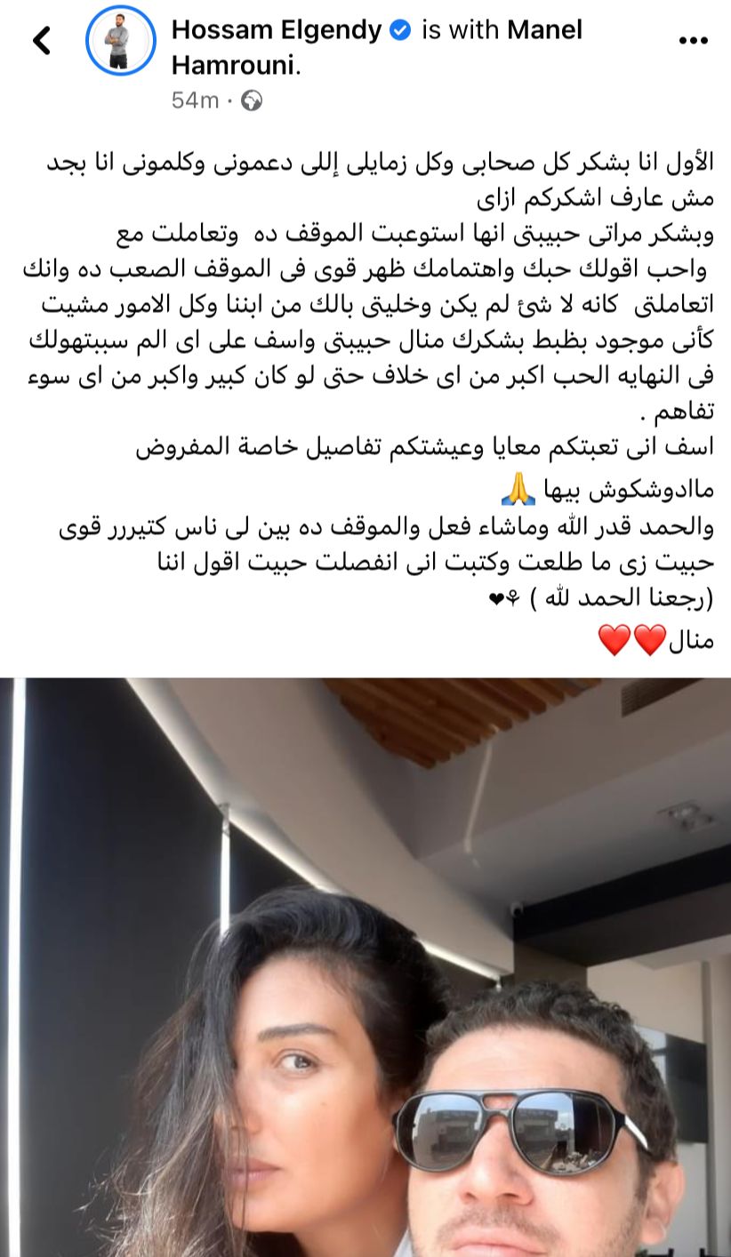 أعلن الفنان حسام الجندي، عودته إلى زوجته التونسية منال حمروني بعد انفصاله عنها، موجهًا الشكر لجميع من دعموه خلال فترة الانفصال عن زوجته.