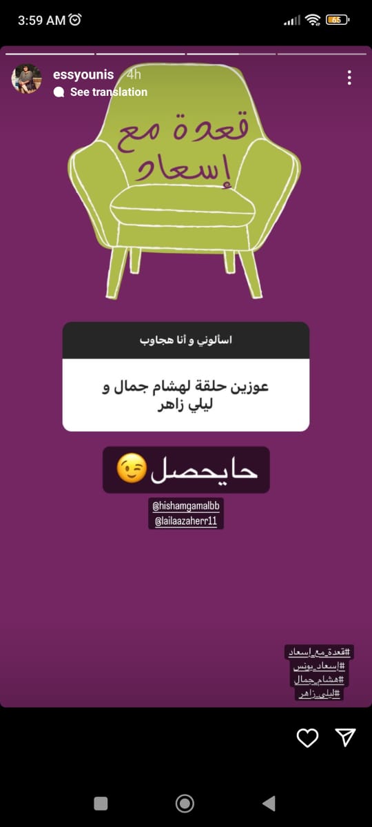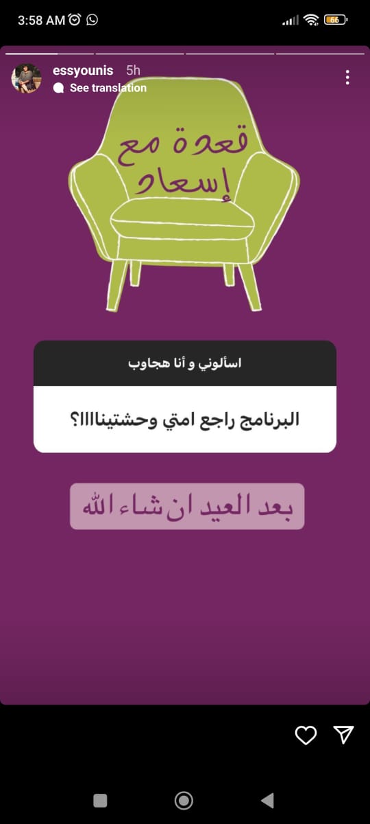 وردت إسعاد يونس على سؤال أحد متابعيها على ستوري حسابها بـ انستجرام، قائلة: بعد العيد إن شاء الله، وهستضيف ليلى زاهر وهشام جمال في الموسم الجديد.