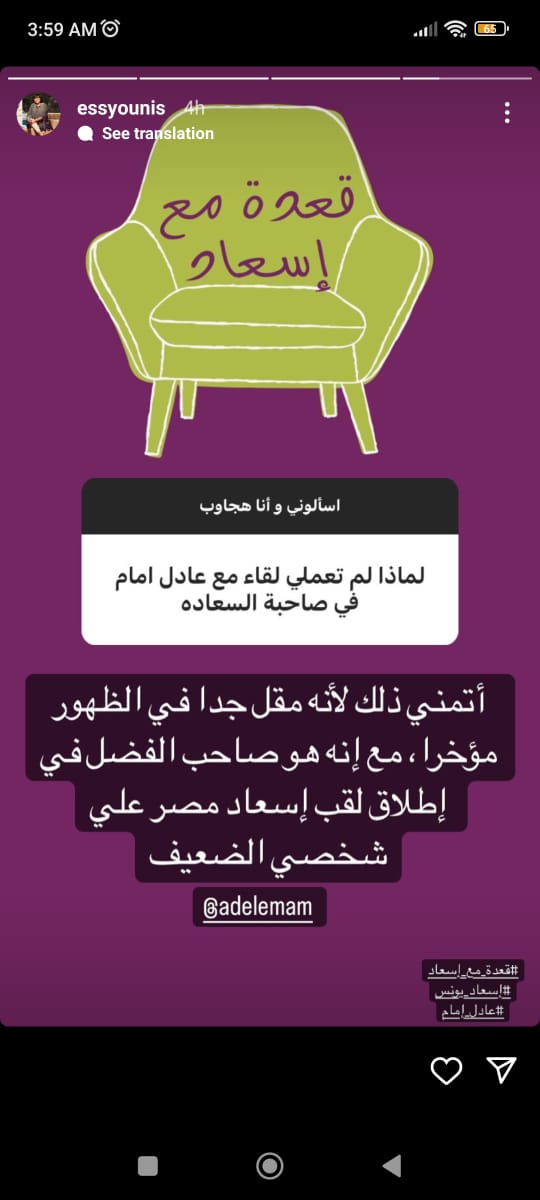 كما وجّه أحد الجمهور سؤالا لـ إسعاد يونس، قائلا: لماذا لا تستضيفي الزعيم عادل إمام في البرنامج؟، وردت قائلة: أتمنى ذلك لأنه مُقل جدًا في الظهور مؤخرًا مع إنه صاحب الفضل في إطلاق لقب إسعاد مصر على شخصي الضعيف.