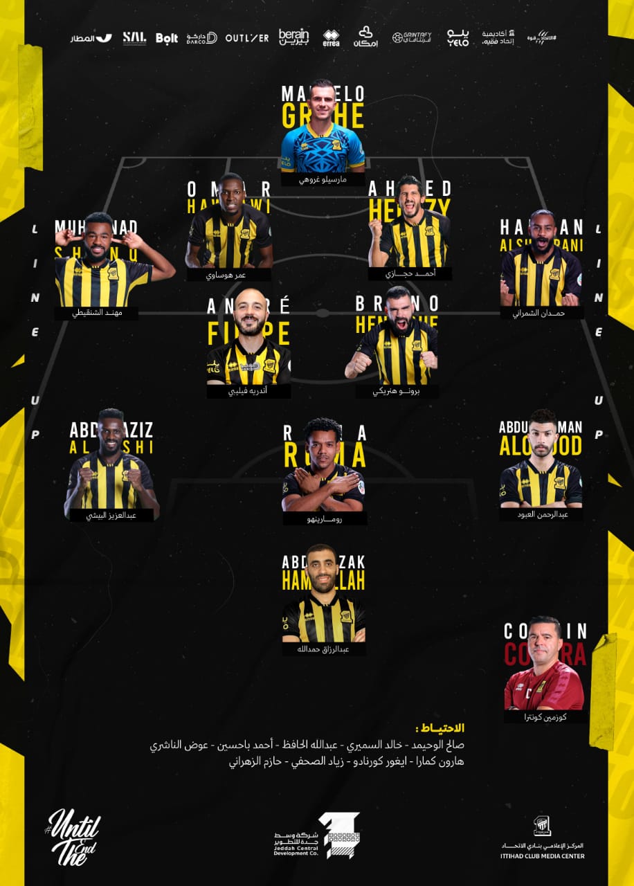وقرر المدرب كوزمين كونترا، مدرب اتحاد جدة، أن يدخل مباراة فريقه لـ مواجهة الاتفاق، بتشكيل مكون من: -