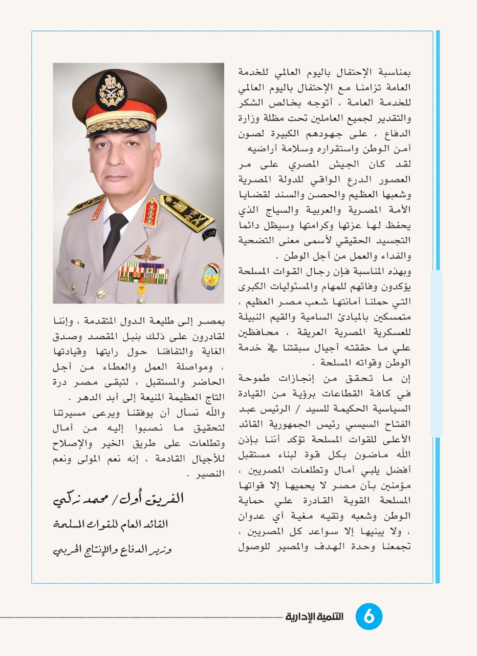 هنأ الفريق أول محمد زكي، القائد العام للقوات المسلحة، وزير الدفاع والإنتاج الحربي، العاملين بوزارة الدفاع، وذلك في كلمته بمجلة التنمية الإدارية الصادرة عن الجهاز المركزي للتنظيم والإدارة، بمناسبة اليوم العالمي للخدمة العامة.