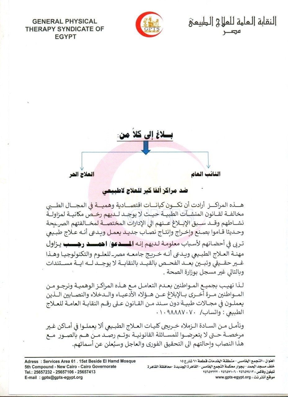 وأضافت النقابة، أن المراكز غير المخصصة، صنعت وأخرجت وأنتجت نصابًا جـديدا يعمل ويدّعى أنه علاج طبيعي؛ تربى في أحضانهم لأسباب معلومة لديهم، إنه المدعو أحمد رجب.. يزاول مهنة العـلاج الطبيعي، ويدّعى أنه خريج جامعة مصر للعلوم والتكنولوجيا، وهذا غير حقيقي.