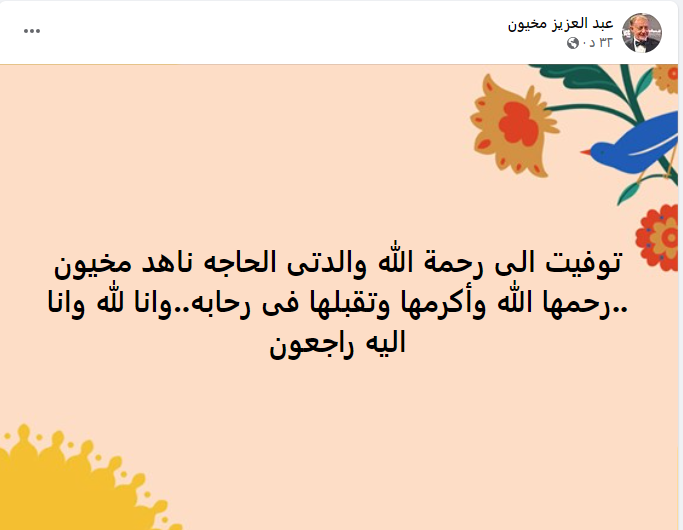 وكتب عبد العزيز مخيون عبر حسابه الشخصي على موقع التواصل الاجتماعي فيسبوك، الآتي: توفيت إلى رحمة الله والدتي الحاجة ناهد مخيون.. رحمها الله وأكرمها وتقبلها في رحابه.. وإنا لله وإنا إليه راجعون.