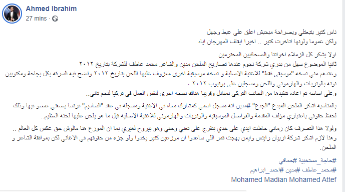 وكتب أحمد إبراهيم على حسابه الرسمي بـ فيس بوك: ناس كتير بتبعتلي وبصراحة مبحبش أعلق على عبط وجهل، ولكن عمومًا ولو أنها أتاخرت كتير، أخيرًا إيقاف المهرجان إياه، أولًا بشكر كل الزملاء إخواتنا والصحافيين المحترمين، ثانيا الموضوع سهل من بدري شركة نجوم عندها تصاريح الملحن مدين، والشاعر محمد عاطف للشركة بتاريخ 2012.