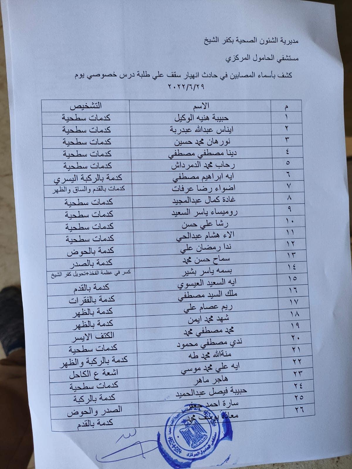 ارتفاع أعداد طلاب الثانوية المصابين في حادث انهيار سقف خشبي بكفر الشيخ لـ 47 مصابا