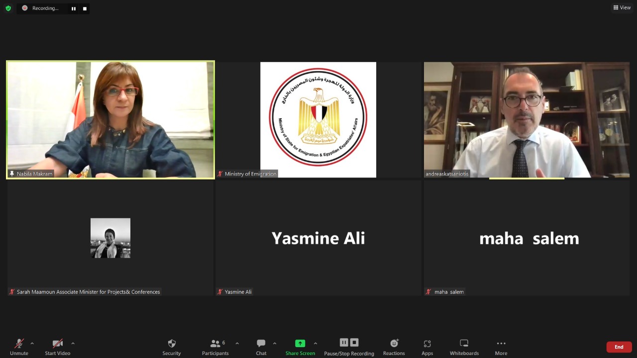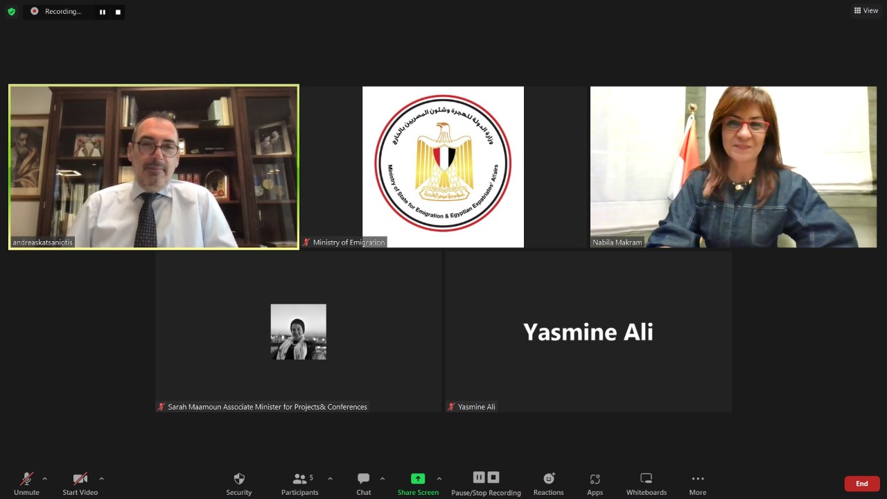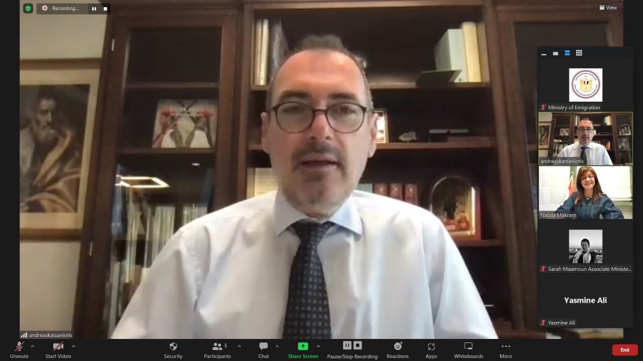 عقدت السفيرة نبيلة مكرم عبد الشهيد، وزيرة الدولة للهجرة وشؤون المصريين بالخارج، لقاءً تشاوريًا عبر تطبيق زووم مع أندرياس كتسانيوتس نائب وزير الخارجية اليوناني لشؤون المغتربين والدبلوماسية العامة، لبحث ترتيبات زيارته المرتقبة إلى مصر والمضي قدمًا في تنفيذ البرامج المُعدّة في في إطار مبادرة إحياء الجذور نوستوس.