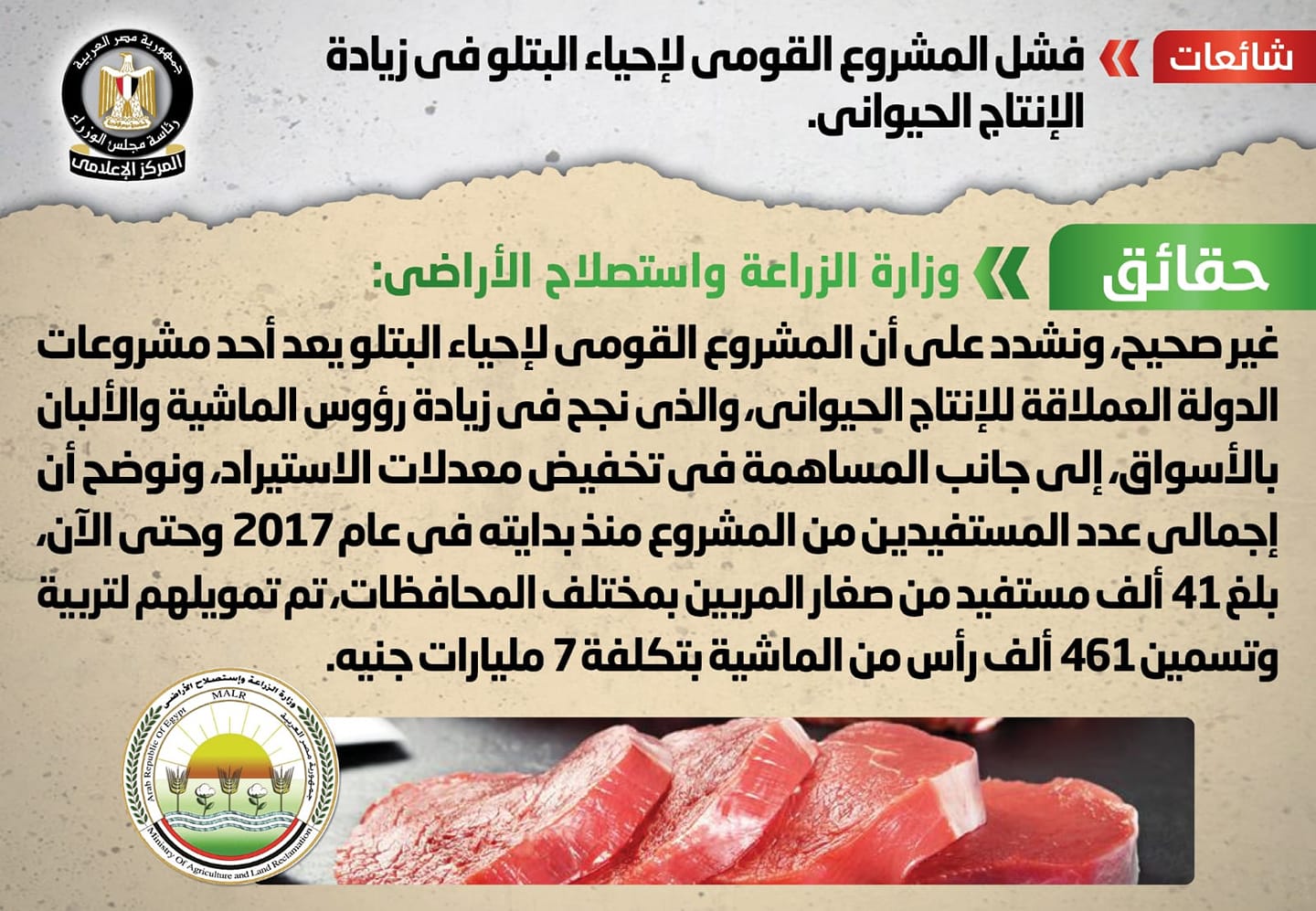 وأوضح المركز الإعلامي لمجلس الوزراء، أنه تواصل بدوره مع وزارة الزراعة واستصلاح الأراضي حول هذه الشائعات، والتي أكدت أنه لا صحة لفشل المشروع القومي لإحياء البتلو في زيادة الإنتاج الحيواني.