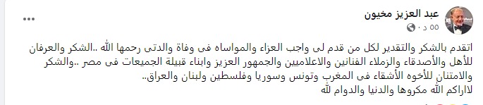وكتب عبد العزيز مخيون، منشورًا عبر حسابه الشخصي بموقع فيسبوك: أتقدم بالشكر والتقدير لكل من قدم لي واجب العزاء والمواساة في وفاة والدتي، رحمها الله.