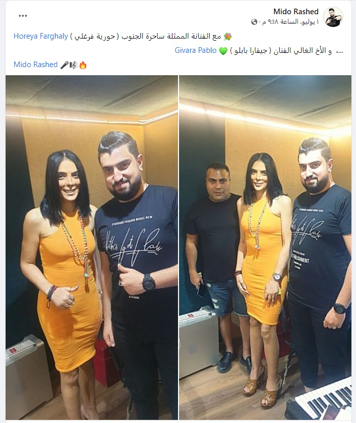 وسبق وروج الموزع ميدو راشد لأعماله مع الفنانة حورية فرغلي، من خلال نشره صورًا تجمعهما من الاستوديو، عبر حسابه الشخصي على فيسبوك، معلقًا بالآتي: مع الفنانة الممثلة ساحرة الجنوب حورية فرغلي والأخ الغالي جيفارا بابلو.
