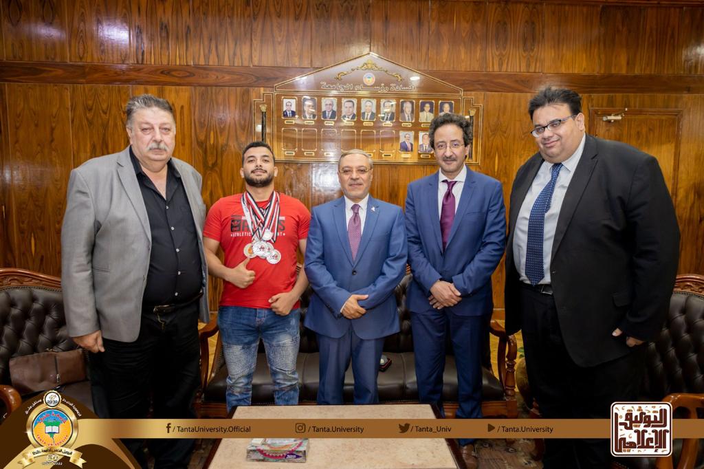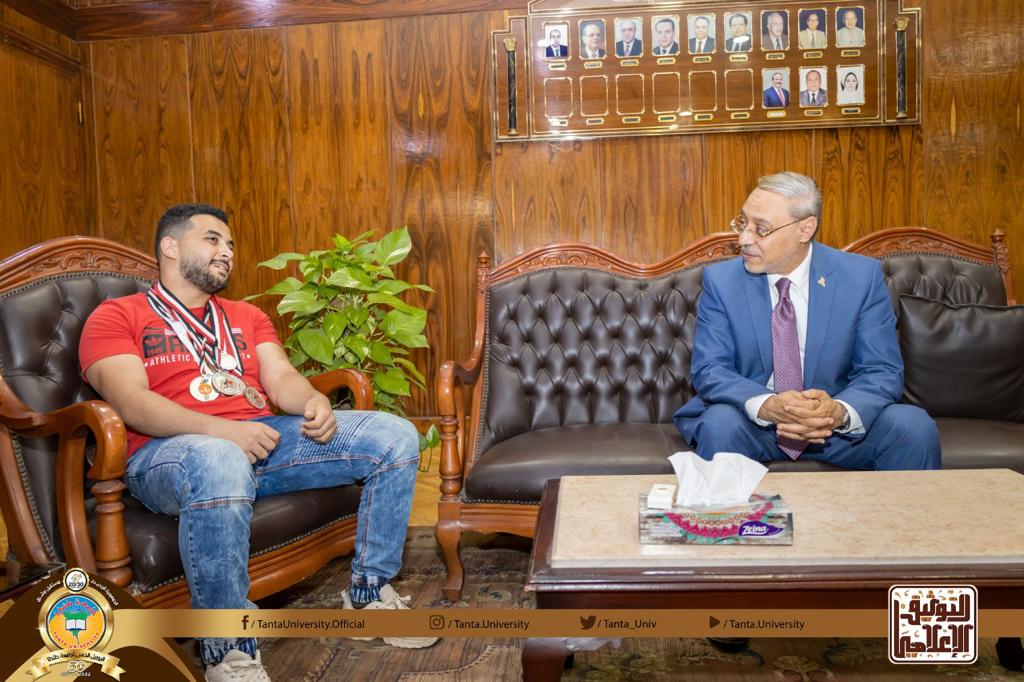 رئيس جامعة طنطا يكرم طالبا من ذوي الهمم حقق بطولات عالمية في رفع الأثقال