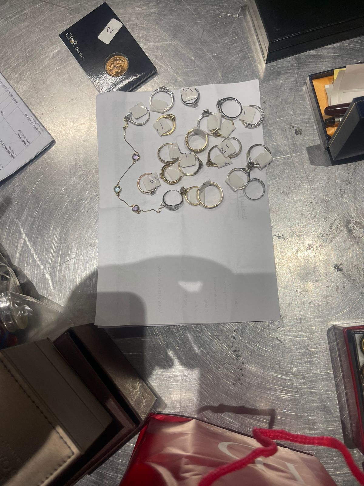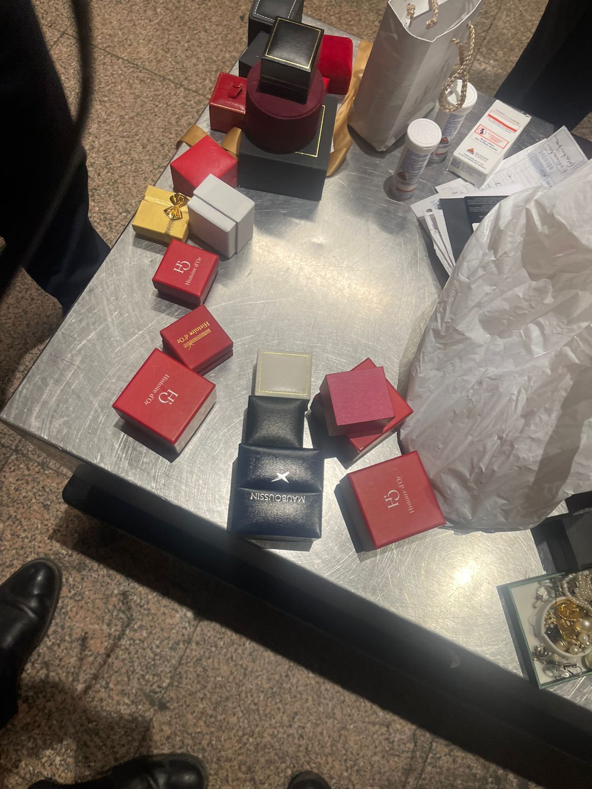 وتم تفتيش حقائب الراكب يدويا مما أسفر عن ضبط كمية المشغولات الذهبية بعضها مرصعة بفصوص من الأحجار الكريمة الألماس عبارة عن خواتم ودبل وانسيالات وسلاسل ودلايات بلغ عددها 37 واحدة.