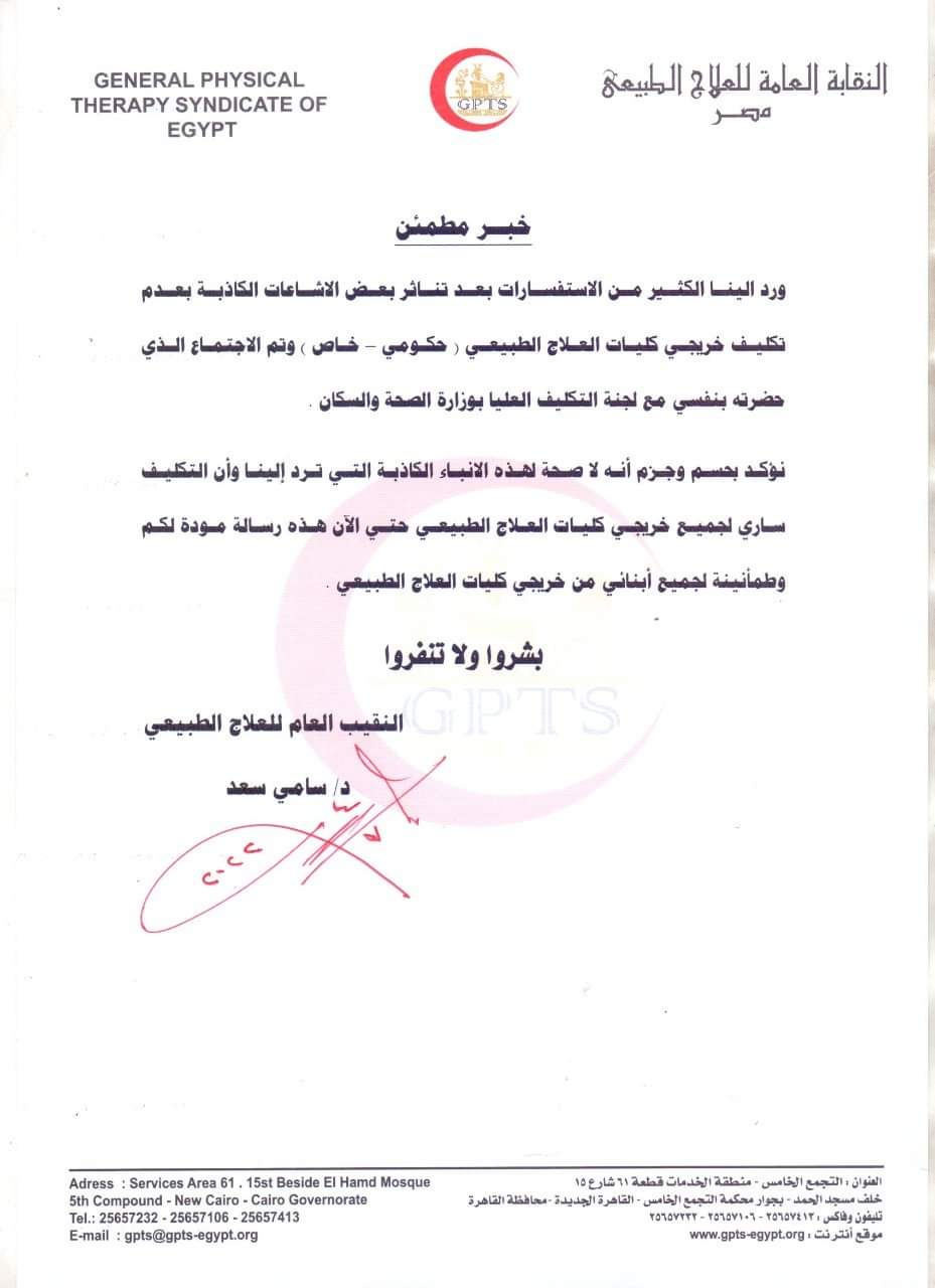وأكد نقيب العلاج الطبيعي، أنه لا صحة لهذه الأنباء الكاذبة التي ترد إلينا، وأن التكليف ساري لجميع خريجي كليات العلاج الطبيعي.