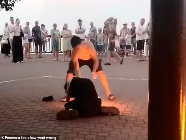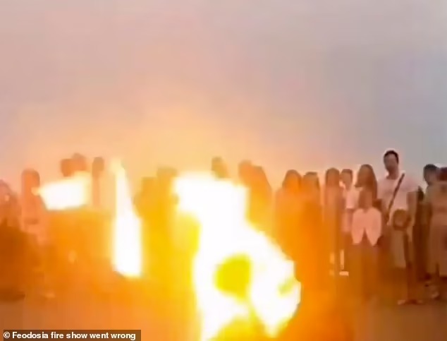 أصيب راقص بحروق شديدة في فمه ووجهه، بعد أن قام بخطأ خلال تأديته رقصة استعراضية أمام عشرات السياح في شبه جزيرة القرم، وفقًا لـ صحيفة ديلي ميل البريطانية.