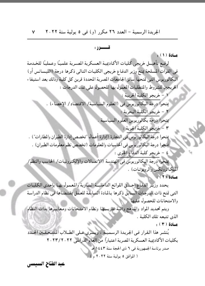 - المادة الثالثة: ينشر هذا القرار في الجريدة الرسمية، ويسرى على الطلاب الملتحقين الجدد بكليات الأكاديمية العسكرية المصرية، اعتبارًا من العام الدراسي 2022 -2030.