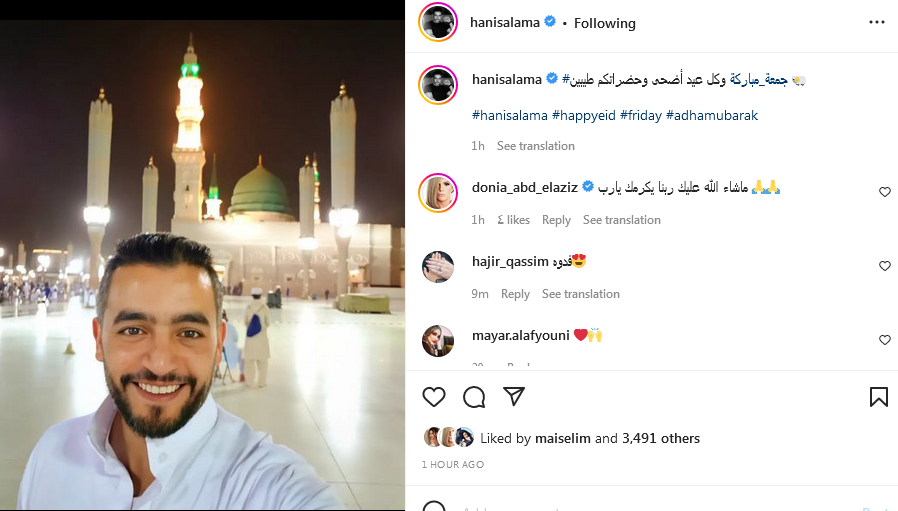 وشارك الفنانة هاني سلامة، متابعيه بصورة له عبر حسابة الشخصي بموقع انستجرام، وهو يؤدي مناسك الحج.. وعلق على الصورة قائلًا: جمعة مباركة وكل عيد أضحى وحضراتكم بخير.