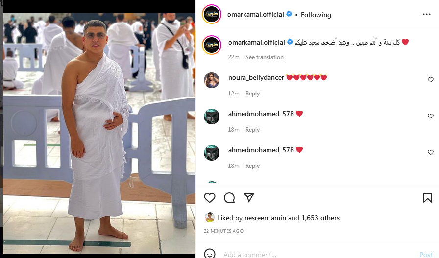 ونشر مطرب المهرجانات، عمر كمال؛ متابعيه صورة له عبر حسابة الشخصي بموقع انستجرام، من إمام الكعبة المشرفة، وعلق عليها قائلًا: كل سنة وأنتم طيبين وعيد أضحى سعيد.