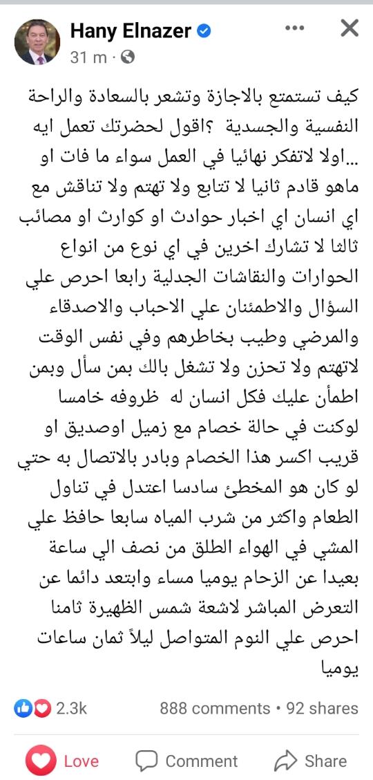 وكتب الناظر عبر صفحته على فيسبوك: لكي تستمتع بالإجازة، وتشعر بالسعادة والراحة النفسية والجسدية، أولا: لا تُفكر نهائيًا في العمل سواء ما فات أو ما هو مقبل.