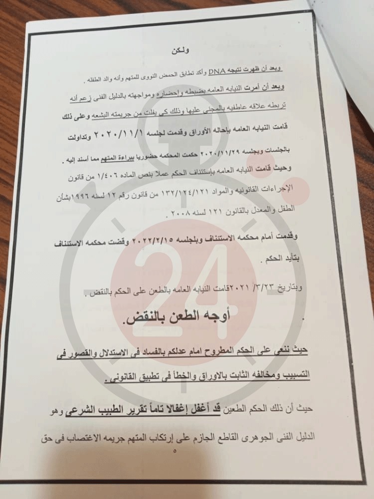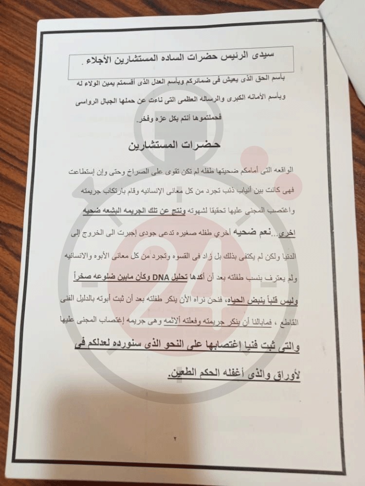 جاء نص المذكرة التي حصل القاهرة 24 على نسخة منها: الواقعة التي أمامكم ضحيتها طفلة لم تكن تقوى على الصراخ حتى وإن استطاعت فهي كانت بين أنياب ذئب تجرد من كل معاني الإنسانية وقام بارتكاب جريمته، واغتصب المجني عليها تحقيقًا لشهوته ونتج عن تلك الجريمة البشعة ضحية أخرى وهي طفلة صغيرة تدعى جودي أجبرت على الخروج إلى الدنيا، ولكن لم يكتف المتهم بذلك بل زاد في القسوة وتجرد من كل معاني الأبوة والإنسانية، ولم يعترف بنسب طفلته بعد أن أكدها تحليل DNA وكأن ما بين ضلوعه صخرة وليس قلبا ينبض، فنحن نراه الآن ينكر طفلته بعد أن ثبت أبوته بالدليل الفني القاطع، فما بالنا أن ينكر جريمته وفعلته الآثمة وهي جريمة اغتصاب المجني عليها والتي ثبت فنيا اغتصابها.