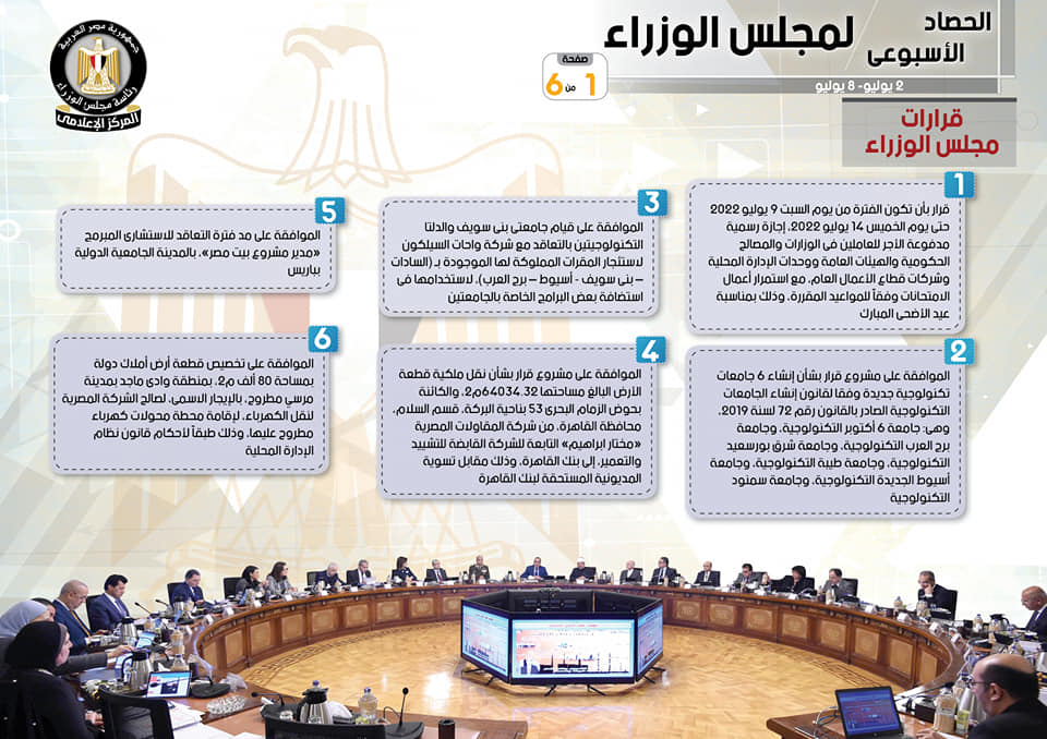 إنشاء 6 جامعات تكنولوجية وإجازة عيد الأضحى.. ننشر الحصاد الأسبوعي للحكومة | انفوجراف