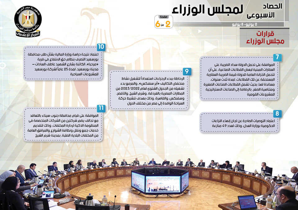 ووافق مجلس الوزراء على تحمل الدولة سداد الضريبة على العقارات المبنية لبعض القطاعات الصناعية، على أن تتحمل الخزانة العامة للدولة قيمة الضريبة العقارية المستحقة عن تلك القطاعات، لمدة 3 سنوات، مساندة لها، بحيث تشمل القطاعات الصناعات الصغيرة ومتناهية الصغر، بالإضافة إلى الصناعات الاستراتيجية للمشروعات القومية، إلى جانب اعتماد التوصيات الصادرة عن لجان إنهاء النزاعات الحكومية بوزارة العدل، وذلك لعدد 49 منازعة، والإحاطة ببدء الإجراءات استعدادًا لتشغيل نشاط منخفض التكاليف -أير سفنكس، والمزمع بدء تشغيله من الجدول الشتوي لعام 2022/2023 من المطارات المصرية بالغردقة، شرم الشيخ، الأقصر، سفنكس، والقاهرة، وذلك بهدف تنشيط حركة السياحة الوافدة إلى مصر من مختلف الدول، كما تم اعتماد نتيجة دراسة وزارة المالية بشأن طلب محافظة بورسعيد التصرف بنظام حق الانتفاع فى قرية مرحبا، الكائنة بشارع الشهيد عاطف السادات – مدينة بورسعيد، لمدة 25 عاما لشركة بورسعيد للمشروعات السياحية، بالإضافة إلى الموافقة على قيام محافظة جنوب سيناء، بالتعاقد مع تحالف يضم شركتين من الشركات المتخصصة في المنظومة الذكية لإدارة المخلفات، وذلك لتقديم خدمات جمع ونقل ونظافة الشوارع والمرافق العامة من المخلفات البلدية الصلبة، بمدينة شرم الشيخ.