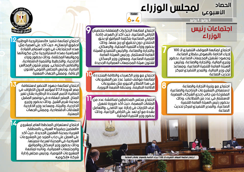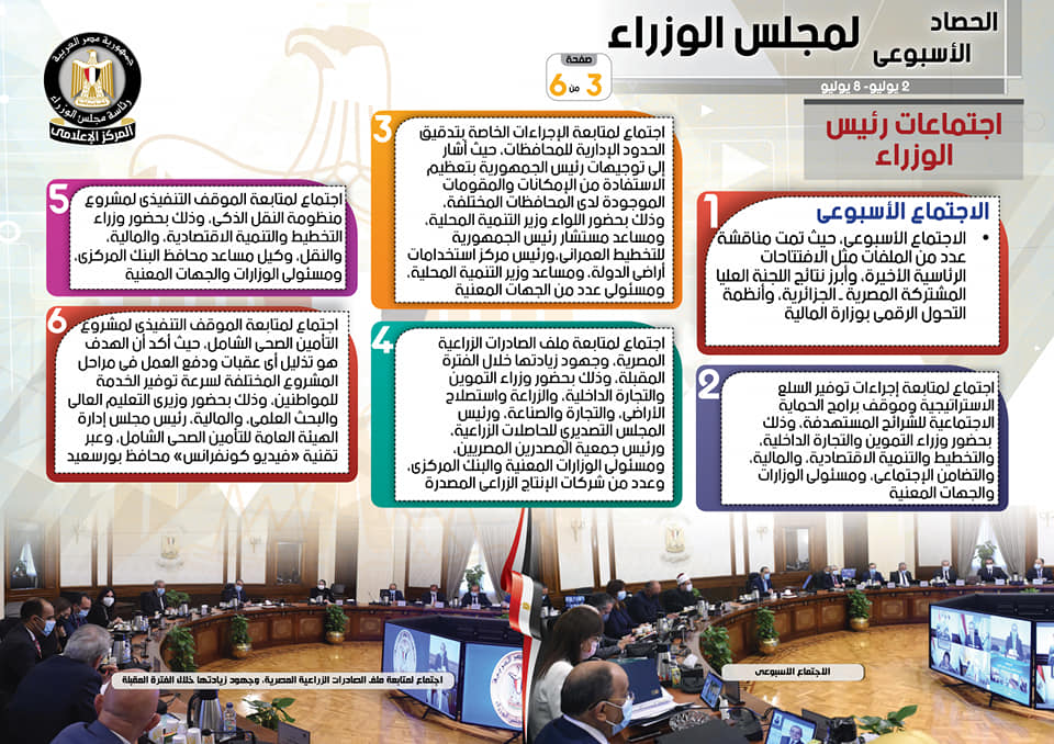 نشر المركز الإعلامي لمجلس الوزراء، تقريرًا شمل انفوجراف؛ سلّط من خلالها الضوء على الحصاد الأسبوعي لمجلس الوزراء، وذلك خلال الفترة من 2 حتى 8 يوليو 2022، والذي تضمن الموافقة على عدد من القرارات، فضلًا عن الاجتماعات التي عقدها الدكتور مصطفى مدبولي، رئيس مجلس الوزراء، بالإضافة إلى ما قام به من أنشطة.