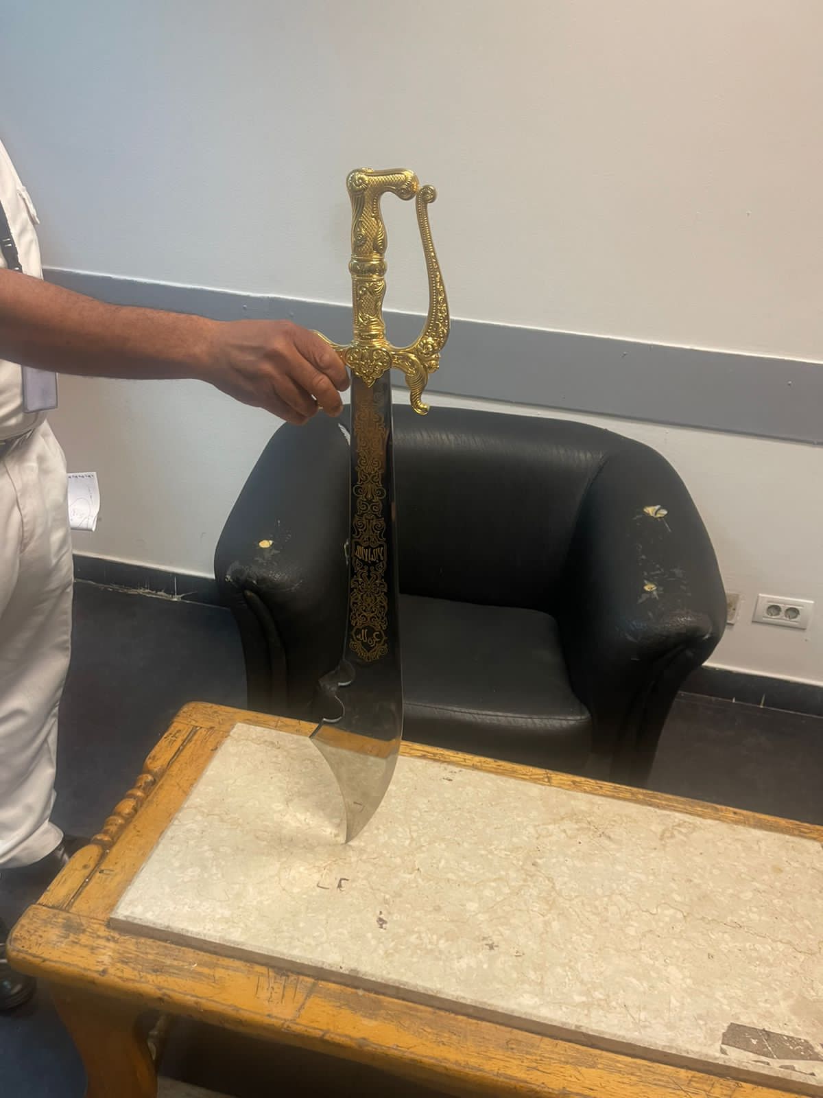وبتفتيش حقائب الراكب يدويًا بواسطة السيد موسى مأمور الجمرك، وجد سيف معدني ذو نصل حاد أفاد تقرير المقدم أحمد حمد من إدارة الحماية المدنية، المفرقعات، بأنه محظور حيازته طبقًا للقانون رقم 394 لسنة 1951.