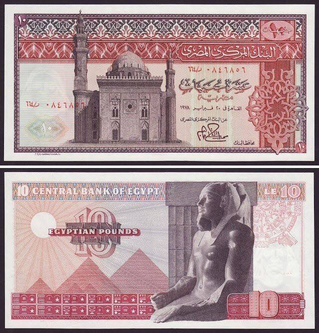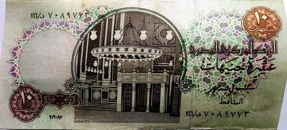 امتازت فئة الـ عشرة جنيهات التي صدرت في السبعينيات، بوجه لجامع السلطان حسن، وتحديدا الواجهة المطلة على ميدان القلعة، الذي يصل عمره نحو 660 عاما، ويمنيه مطرقة معدنية، تستخدم على أبواب المساجد والمدارس الأثرية.
