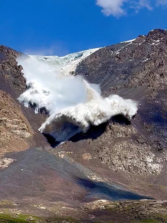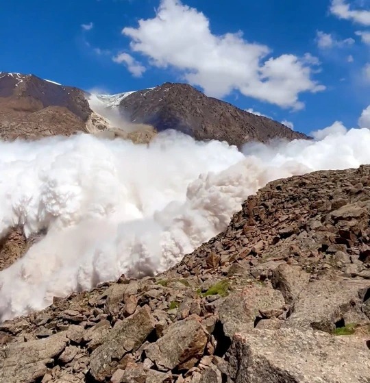 التقط أحد السائحون البريطانيون أثناء زيارته لجبال تيانشان لحظة انهيار جليدي ضخم في دولة قيرغيزستان، وتُظهر اللقطات سيلًا من الثلوج يتساقط على جبال تيان شان، مما أجبر المجموعة على الاحتماء.