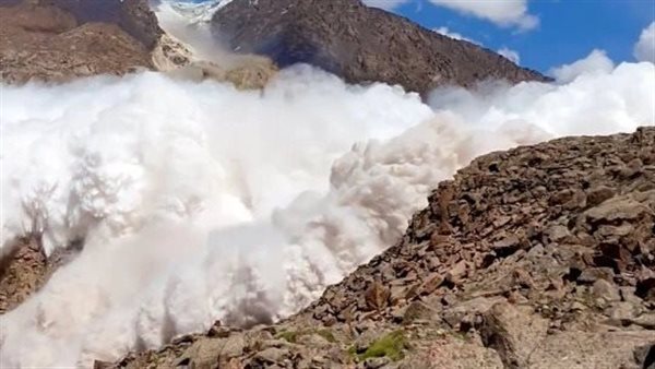 سائح يسجل لحظة انهيار جليدي لأحد الجبال بـ قيرغيزستان ويمر من فوقه | فيديو