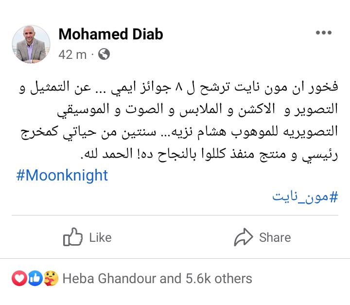 وكتب محمد دياب، عبر حسابه الشخصي بموقع التواصل الاجتماعي فيسبوك: فخور إن مون نايت ترشح لـ 8 جوائز إيمي، التمثيل والتصوير والأكشن والملابس والصوت والموسيقي التصويرية للموهوب هشام نزيه.. سنتين من حياتي كـ مخرج رئيسي، ومنتج منفذ، كللوا بالنجاح ده.. الحمد لله.