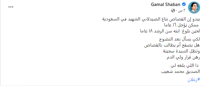 وأشار الطبيب جمال شعبان، في منشور عبر مواقع التواصل الاجتماعي فيسبوك، إلى أنه يبدو أن القصاص بتاع الصيدلاني الشهيد في السعودية ممكن يؤجل 16 عاما لحين بلوغ ابنه سن الرشد 18 عاما، وذلك لكي يسأل بعد النضوج هل يصفح أم يطالب بالقصاص، وتظل السيدة سجينة رهن قرار ولي الدم، ودا اللي بلغه لي الصديق محمد شعيب.
