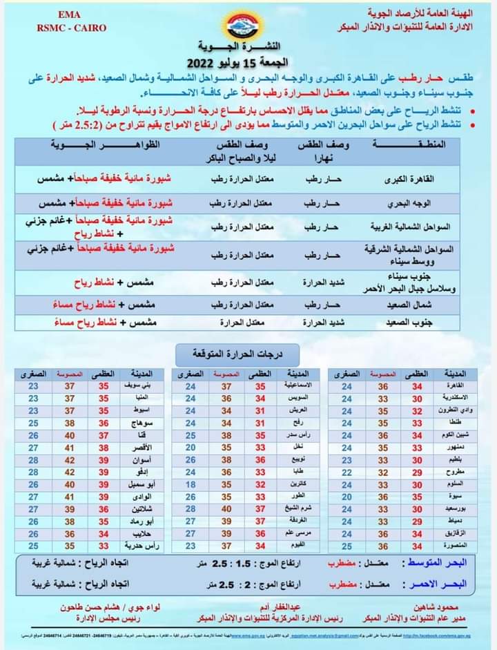 كشفت الهيئة العامة للأرصاد الجوية حالة الطقس، غدا الجمعة، الموافق 15 يوليو 2022، حيث يسود طقس حار رطب خلال فترات النهار على عدة مناطق، وهي القاهرة الكبرى والوجه البحري والسواحل الشمالية وشمال الصعيد.