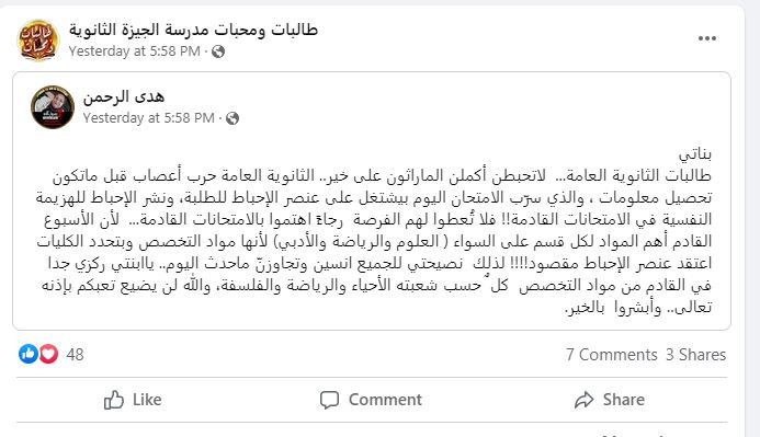 وكتبت مديرة مدرسة الجيزة الثانوية بنات، عبر صفحتها على فيس بوك: بناتي طالبات الثانوية العامة، لا تحبطن وأكملن الماراثون على خير، الثانوية العامة حرب أعصاب قبل أن تكون تحصيل معلومات، والذي سرّب الامتحان يستهدف عنصر الإحباط للطلبة، ونشر الإحباط والهزيمة النفسية في الامتحانات القادمة.