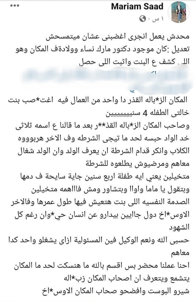 الفتاة تدعى مريم سعد، ونشرت منذ ساعة، عبر صفحتها الرسمية على موقع التواصل الاجتماعي فيسبوك، منشورا أنه أثناء تواجد ابنة خالتها طفلة يبلغ عمرها 4 سنوات، بأحد مراكز الترفيه بمحافظة أسيوط، تم اغتصابها على يد أحد عمال المركز، موضحه أن القصة بدأت عندما جاءت الطفلة تسيل في دمائها وتبكي لوالدتها وهى تقول ماما واوا وتشير بيديها على مكان الاغتصاب ولا تدرك ما حدث بها.