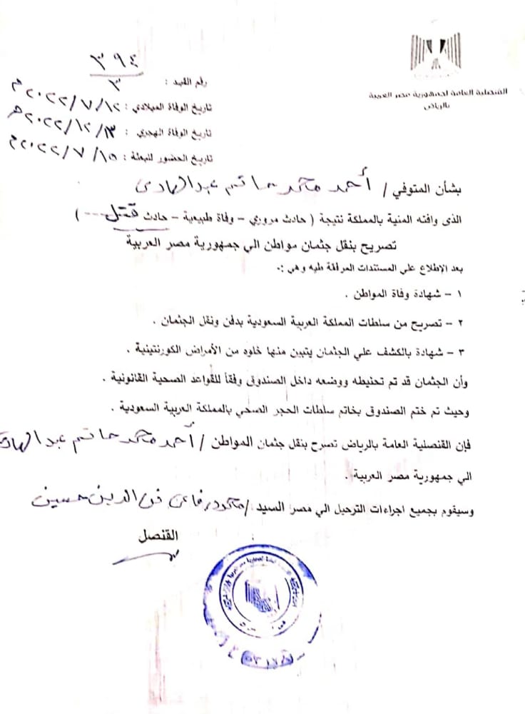 التصريح بنقل جثمان الصيدلي ضحية القتل في السعودية إلى مصر لدفنه